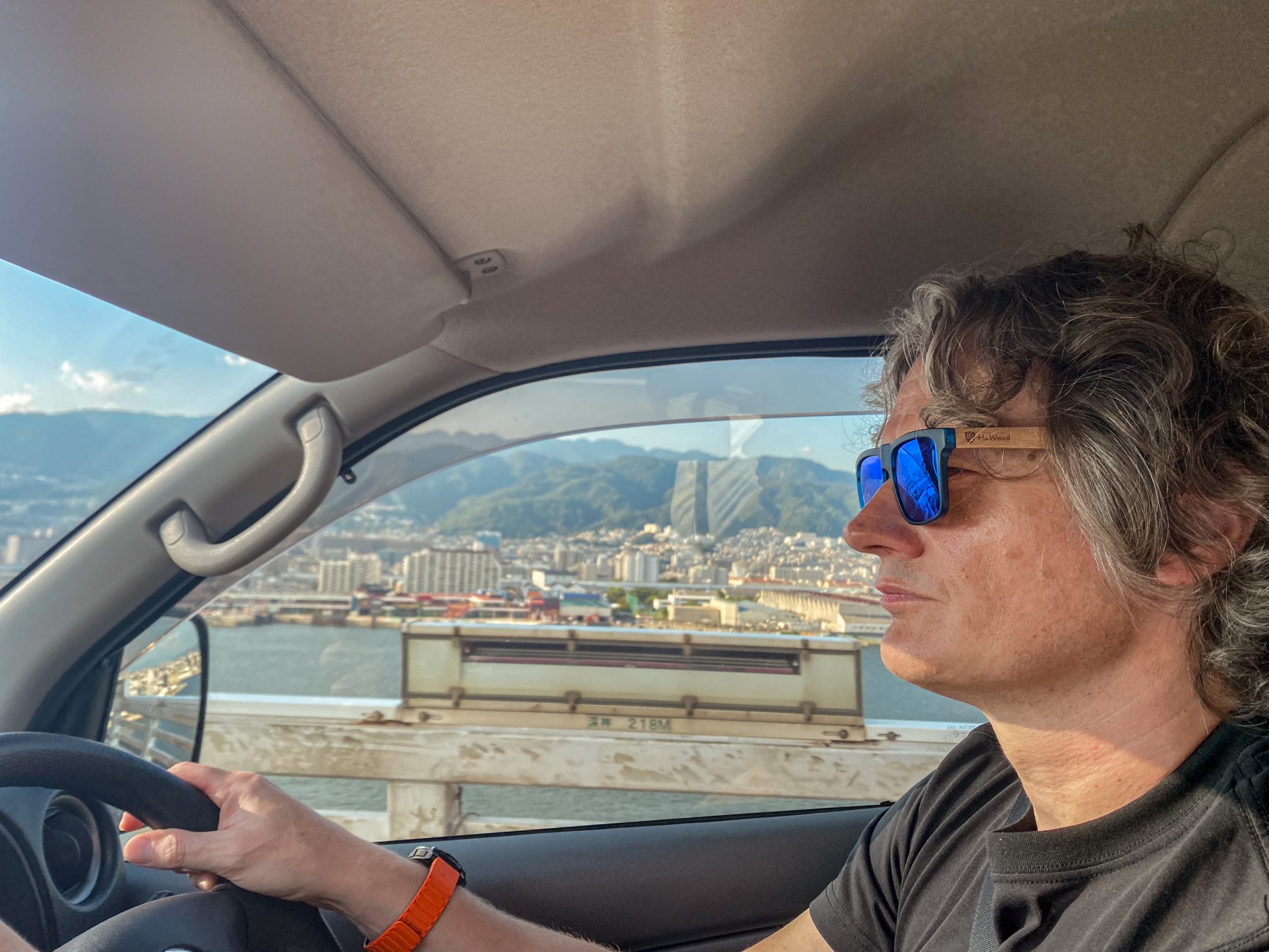 Nun denn, Marcus traute sich das Fahren mit dem „monströsen“ Gefährt zu und ich konnte mich da sehr gut zurücklehnen (Dachte ich 🫣!). So fuhren wir dann mit dem „Riesen“brummer über Osakas faszinierende Brückenvielfalt (Was für eine Ingenieurskunst!) noch am selben Tag bis nach Shikoku und freuten uns auf unser Abenteuer. Bis auf die Insel fuhren wir allerdings nie durch ländliches Gebiet, sondern nahezu nahtlos durch Betonwüsten und Brückengewirr: Von der Millionenmetropole Osaka über die Großstadt Kōbe ging es über die Akashi-Kaikyo-Brücke, die bis 2022 längste Hängebrücke der Welt auf die kleinere, Shikoku vorgelagerte Insel (Awaji Island). Erst ab da sahen wir neben dem Ozean endlich wieder viele Bäume, Felder und kleinere Bauernhöfe.