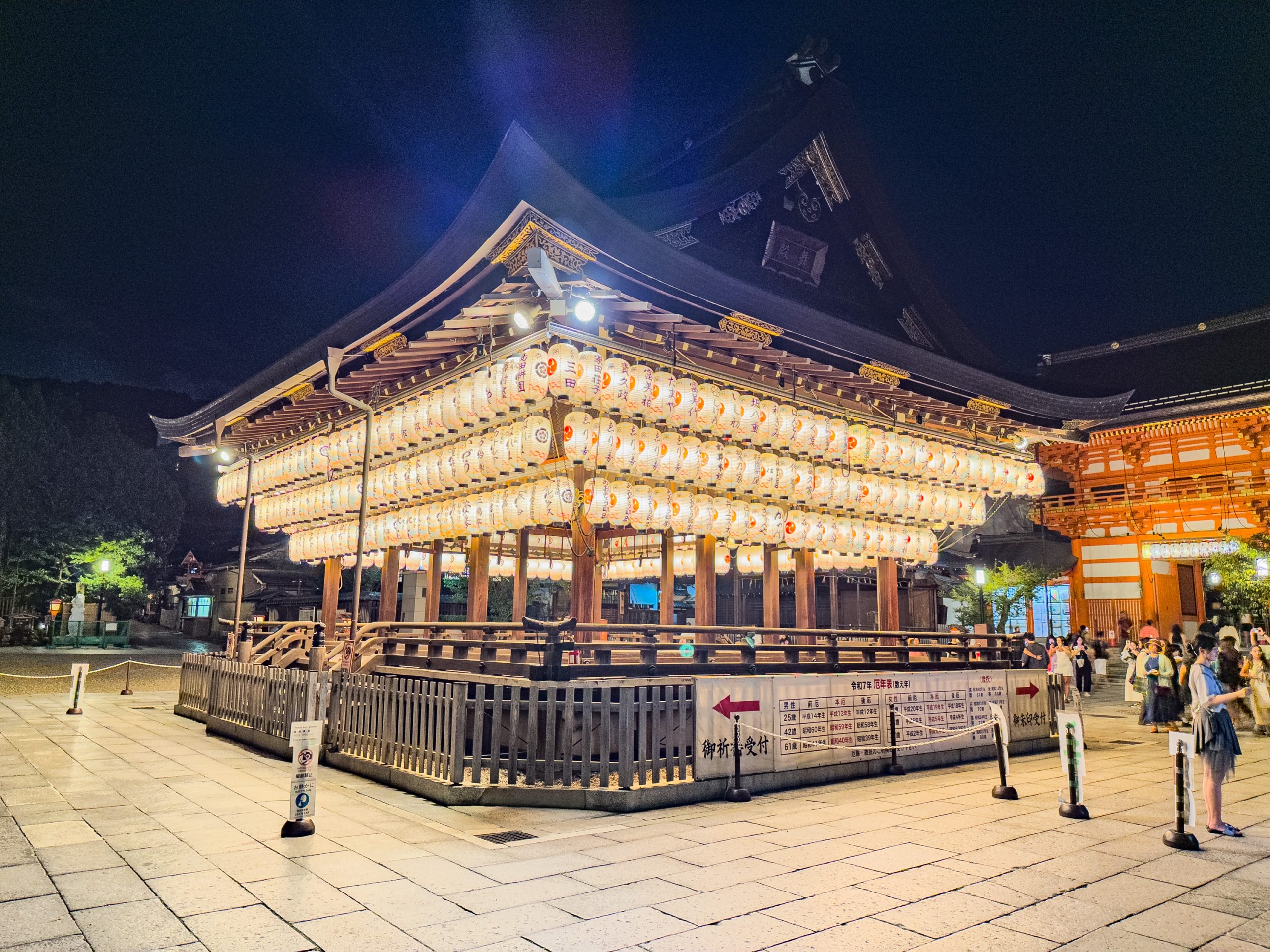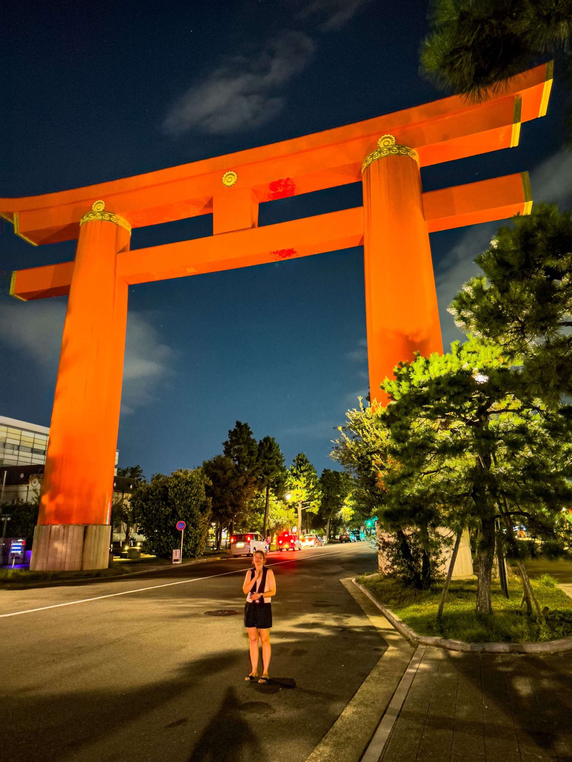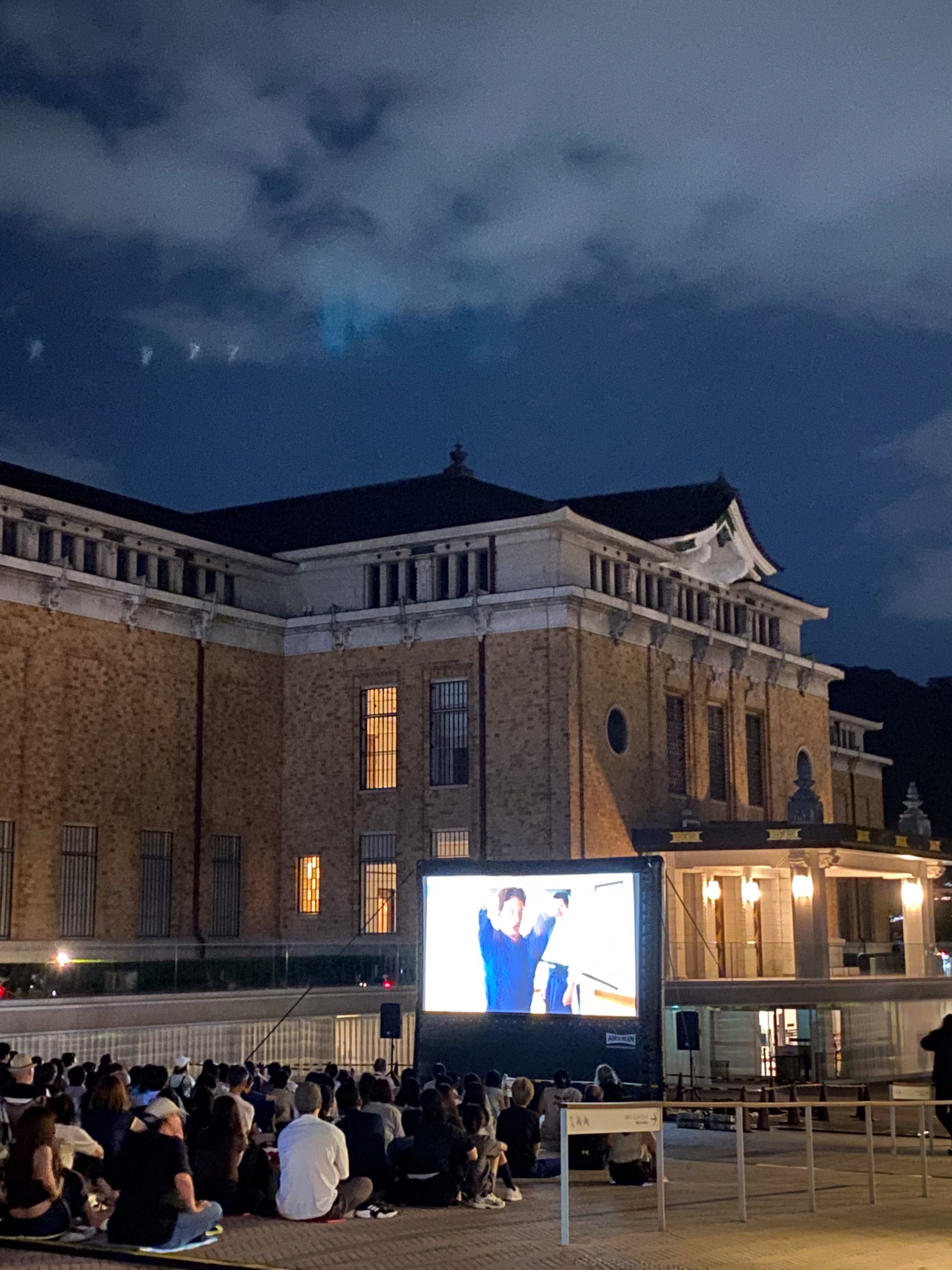 Es war ja unfassbar heiß für den eigentlich frühherbstlichen September in Japan, so um die 30°C. Deshalb zog es uns abends trotz vieler 1000er Schritte nochmal hinaus, um „frische“ Luft zu schnappen. Dabei spazierten wir durch unser altes, ruhiges Viertel am kleinen beleuchtetem Bach entlang und gelangten so auf das unmittelbar angrenzende Gelände rund um den Heian-Jingu Shrine mit seinem riesigen „Grand Torii*“. Wir hörten nur lautes Geschrei und Kampfheräusche, sehr untypisch für die japanische Stille und waren überrascht. Natürlich mussten wir schauen, woher dies rührte und schlichen uns langsam an das Gezeter heran. Wir wurden tatsächlich Zeugen heftigster Kämpfe zwischen rivalisierenden Samurai und schlimmsten Liebesdramen und das in einer lauen Sommernacht! Panik? Nein, sondern große Freude verspürten wir, als wir die Leinwand sahen. Wir gerieten mitten in eine Kinovorstellung eines Opens Air Kinos, aufgebaut vor dem Nationalmuseum der modernen Kunst. Die Stimmung war so angenehm. Umgeben von tollen Gebäuden, einem Park und ungefähr 50 Menschen genossen wir Szenen eines japanischen Dramas. Wir verstanden zwar die Dialoge nicht wirklich, aber die Handlung war auch ohne japanischen Wortschatz leicht nachzuvollziehen: Es ging um Ehre, Liebe und Familie. Typischer Filmstoff also, der scheinbar Kinobesucher auf aller Welt eint.;) Wir fühlten uns überhaupt nicht fremd und genossen so einen unerwarteten schönen Moment in einer lauen Sommernacht.