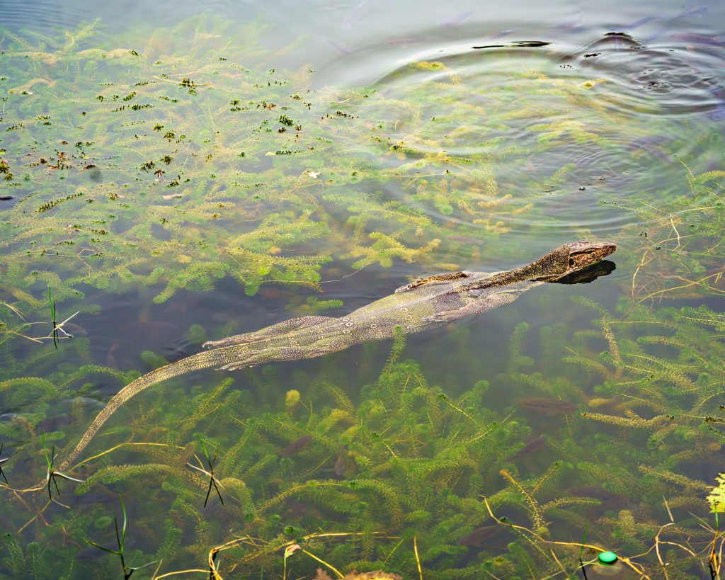 In Kedawang waren die Matratzen zwar sauber und in derlei Hinsicht also ein Upgrade, doch roch es typischerweise wie häufig in tropischen Gebieten ziemlich muffig. Das Häuschen war doppelt so teuer und bot leider nur geringfügige Verbesserungen, aber dafür die richtigen (Matratzen). Von hier aus konnten wir toll ins Grüne schauen, über Reisfelder, die leider des Öfteren mit Gift besprüht wurden (Achtung: Fenster schließen!!!), auf einen kleinen Bach vor der Tür, in dem täglich ein Waran seine Runden schwamm und auf einen kleinen mit Palmen gesäumten Hügel. Zudem entdeckten wir hier ein überdimensional großes Eichhörnchen, welches sich stets beschwerte, sobald wir mal ein Foto machen wollten und Eisvögel sowie Seeadler.