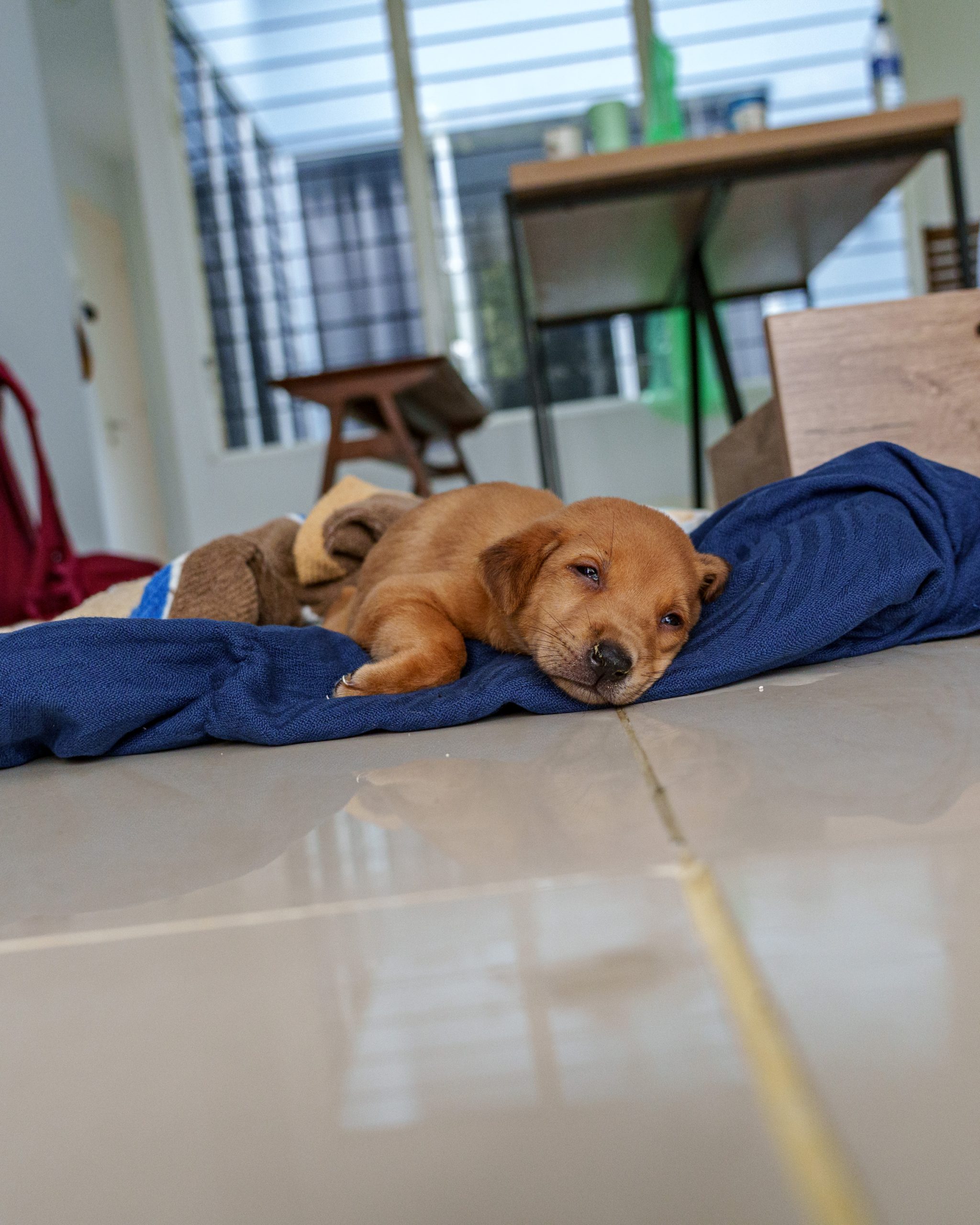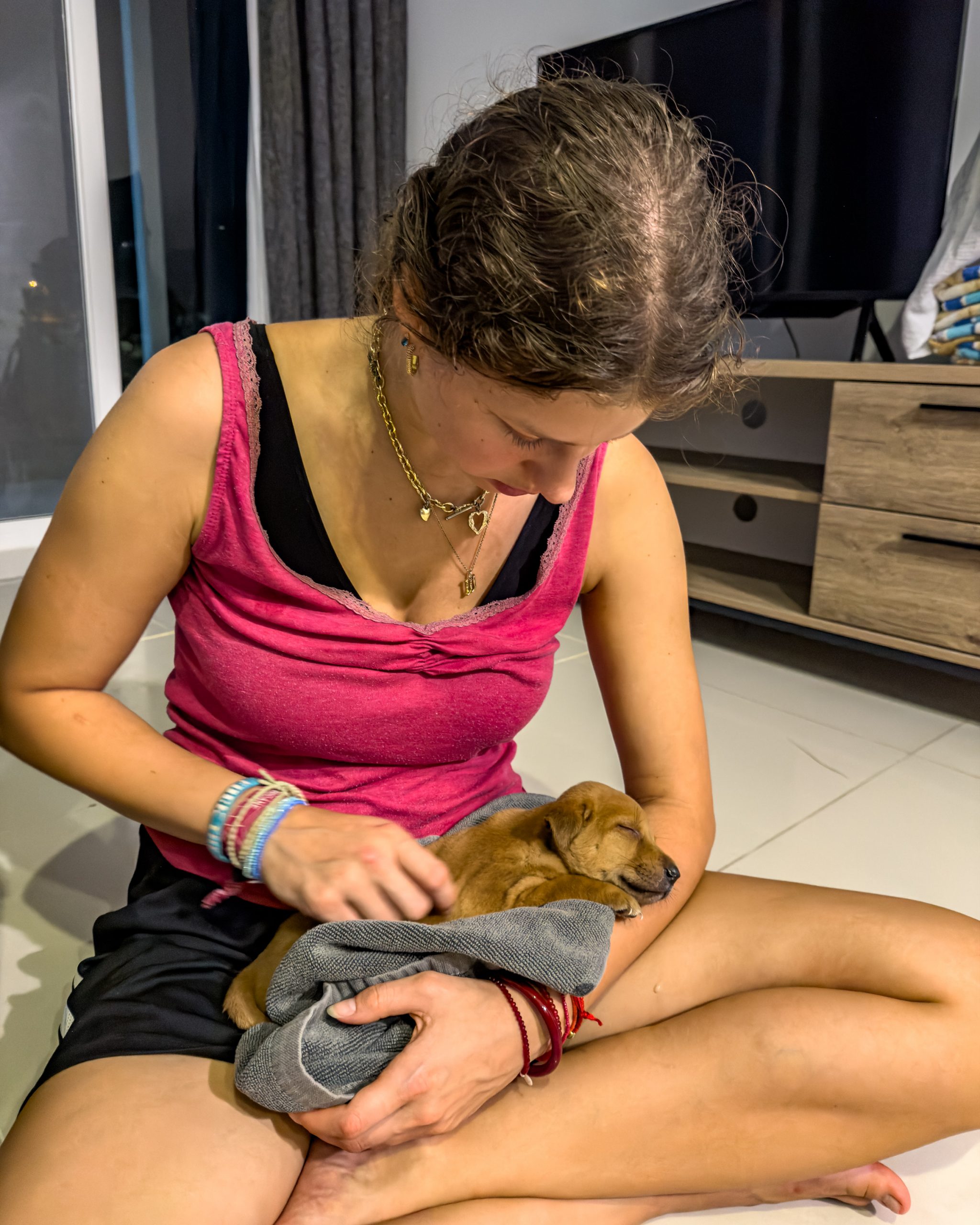 Pine und Skadi haben ihn am Strand gefunden, wo er winselnd seine Mama suchte. Diese war jedoch verschwunden und auf Grund seiner Verfassung entschieden sie, ihn erstmal mitzunehmen. Am Morgen hofften wir natürlich, dass Papaya die Nacht überlebt hatte. Ein kleines Jaulen überzeugt uns davon und so machten wir uns daran, einen Survivalplan für den zarten Kämpfer zu schmieden. Er wog ja gerade mal 500 g und war so schwach, dass er noch einmal laufen konnte.