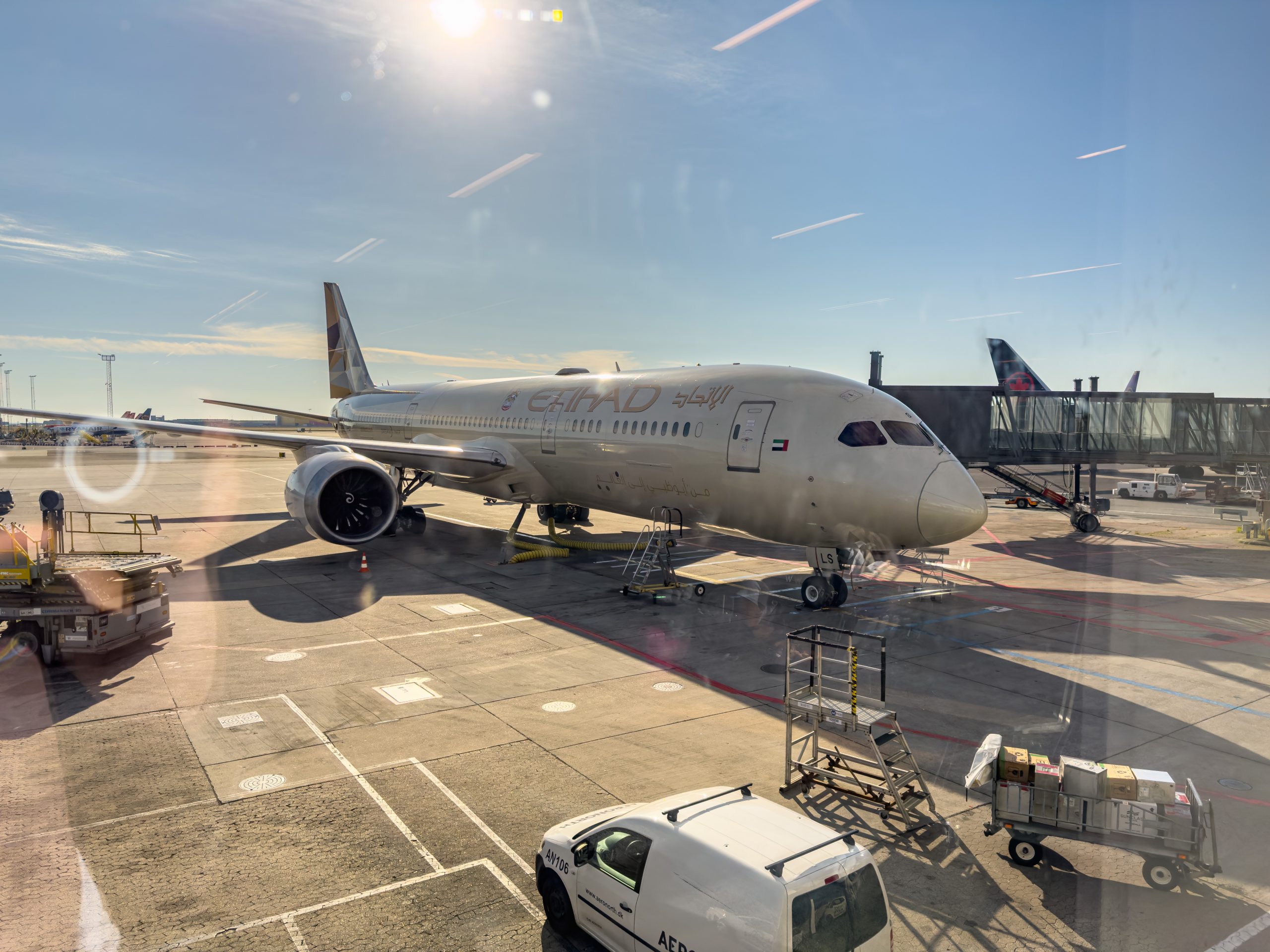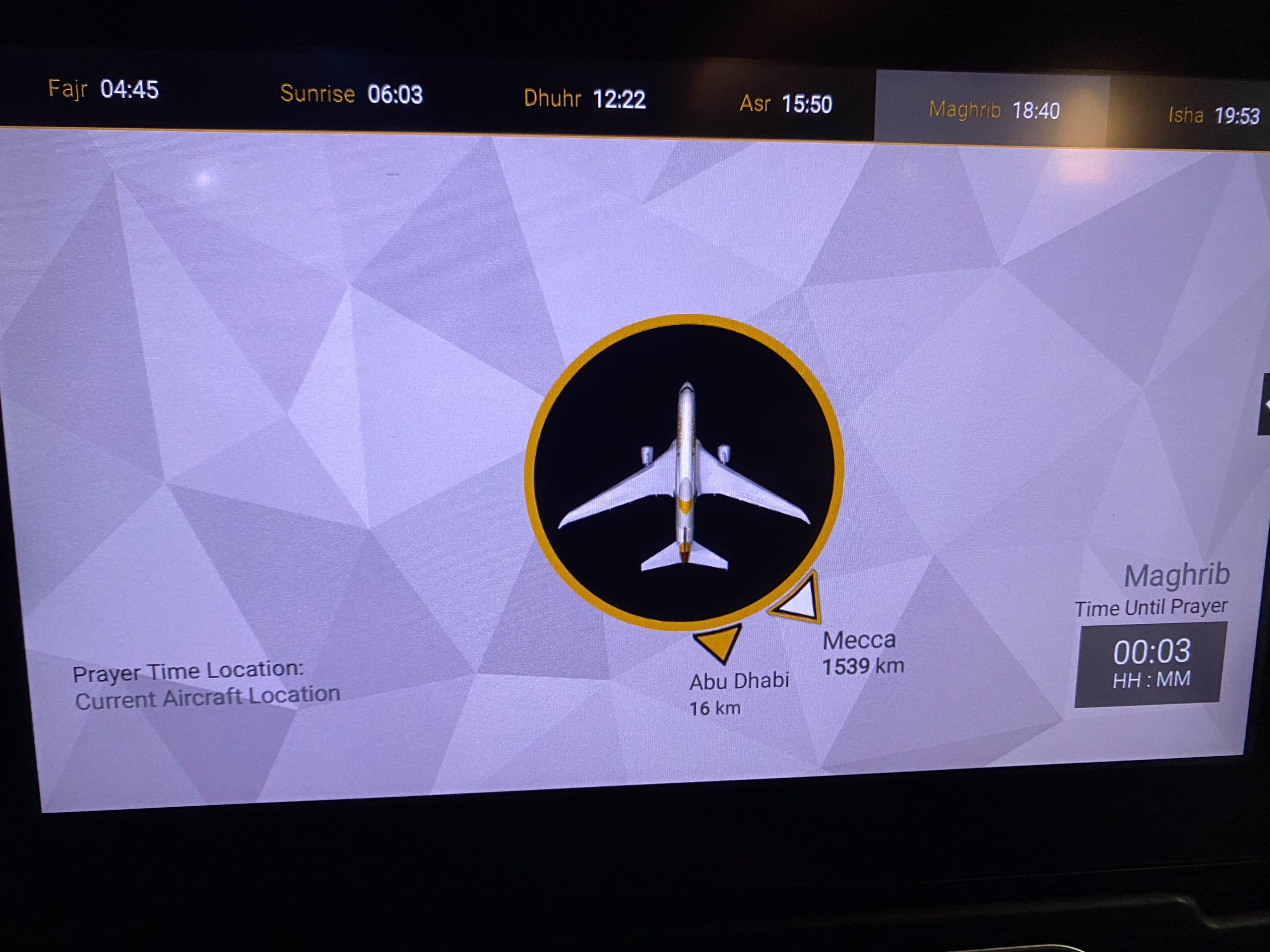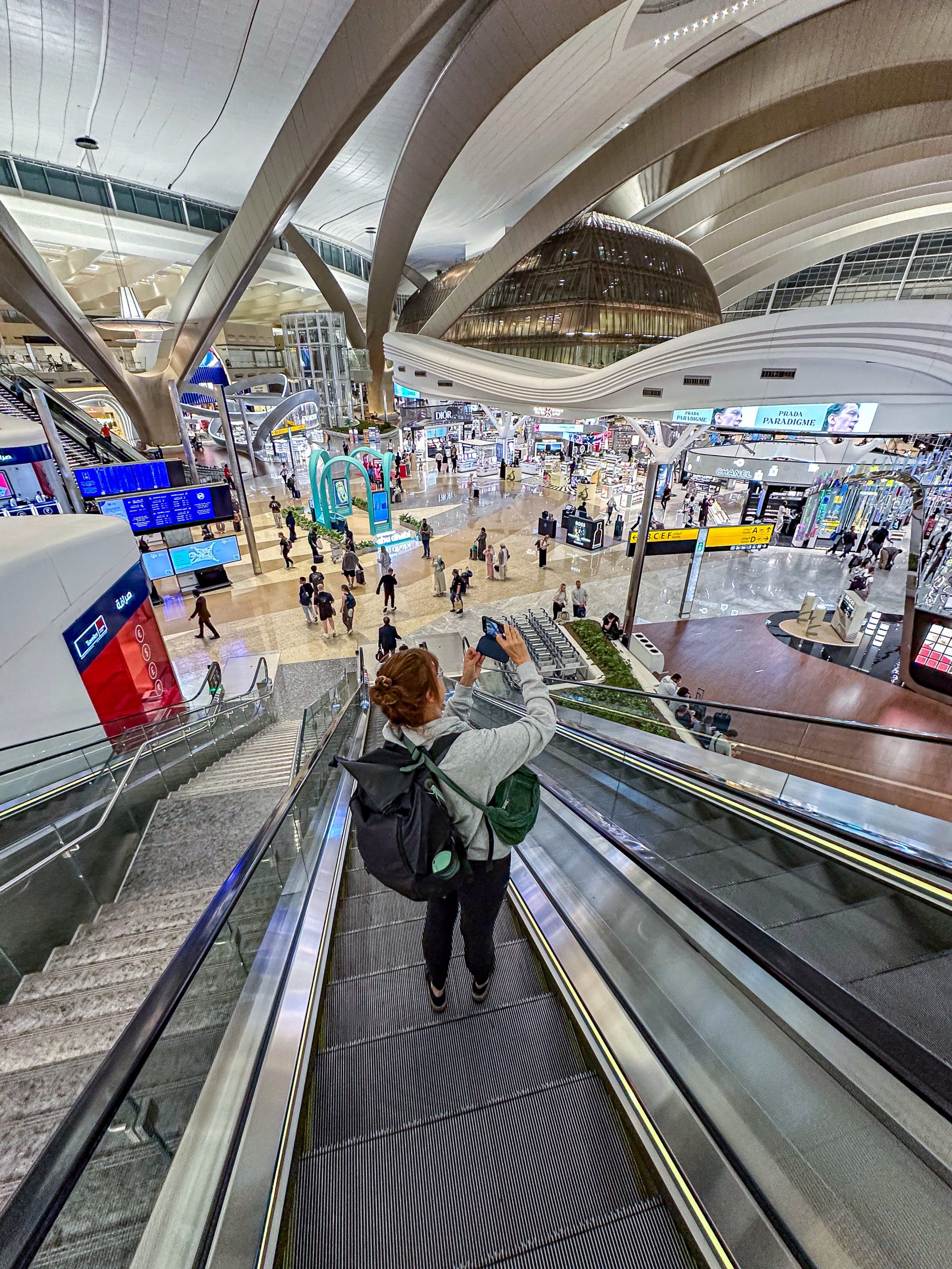 „Prepare for landing.“ und schon waren wir in Kopenhagen, haben schnell noch ein kleines Frühstück auf dem quirligen Flughafen gegessen und flogen schon weiter nach Abu Dhabi. Auch dieser Flug verlief ohne Turbulenzen und die Airline können wir nur wärmsten empfehlen. Wirklich interessant fand ich, dass beim Flugverlauf immer angegeben ist, wo Mekka liegt und wann das nächste Gebet zu sprechen sei. Sechs Stunden später hatten wir noch 2 Stunden Zeit, um durch den hochmodernen Wüstenflughafen mit seiner außergewöhnlichen Architektur zu schlendern. Unfassbar luxuriös waren hier auf jeden Fall die Toiletten. Ich schreibe ja sonst nichts darüber, aber die haben mich schon echt beeindruckt. Ich sage nur holzgetäfelte Wände und Decken, vergoldete Armaturen, alles vollautomatisch und blitzsauber… 😁.