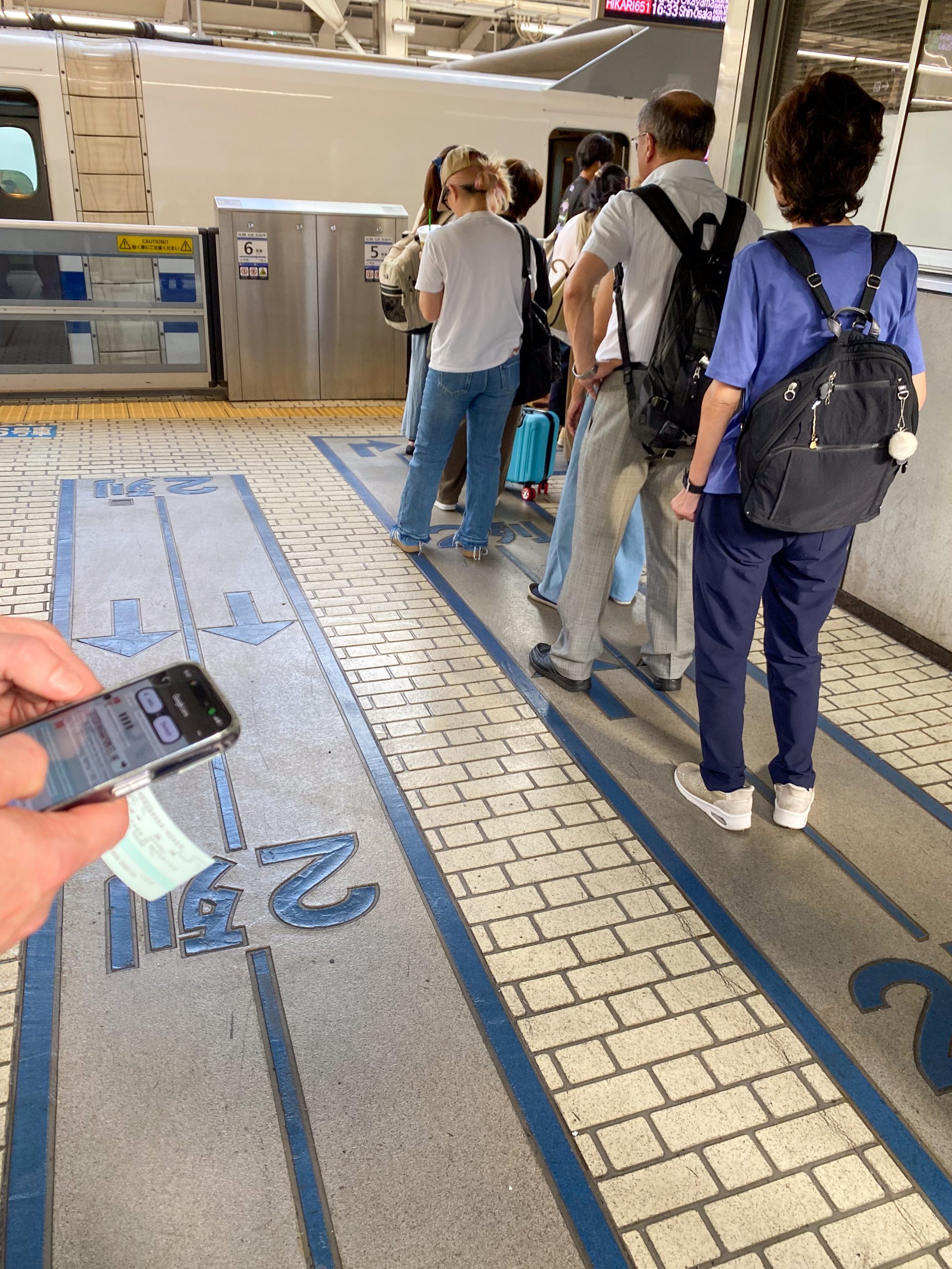Für den Nachtflug nach Tokio warfen wir uns nun doch wieder die Pillen ein und hatten ja das Angebot angenommen, für einen schmalen Taler (130 €) auch den 3. Sitz in unserer Reihe zu buchen. Dadurch hatten wir für unsere Economy-Verhältnisse ausreichen Platz, um mehrere Stunden zu schlafen. Nach 10 Stunden und für uns nach japanischer Zeit um 12:00 Uhr hieß es dann „Yōkoso (ようこそ)“ („Willkommen“) in Tokio. An der Gepäckausgabe ging alles recht zügig, nicht zuletzt dank der Angestellten, welche die Koffer vom Band holen und zügig, jedoch vorsichtig in Reih- und Glied aufstellen. Jetzt folgte für uns eine lange Stunde des Organisierens: SIM-Karte fürs Internet, Tickets für den Bus nach Tokio und für die anschließende Fahrt mit dem Shinkansen (Schnellzug – wirklich rasend schnell!!!) nach Atami. Zwischendurch war tatsächlich mein erster Gang zu Starbucks, wo ich mir ob der Hitze einen leckeren Eiscafé und für unseren Weg noch 2 Baguettes gekauft habe. Tatsächlich habe ich das geholt, weil ich noch gar nicht in Probierlaune war und beides sofort identifizieren konnte 😂. Glücklicherweise steht an jeder Ecke im Flughafen helfendes Personal, welches geduldig deine Fragen beantwortet. Nur leider versteht man nichts. Aber auch hier halfen Hände, Füße und ein geduldiges Lächeln auf beiden Seiten. Nach einer weiteren Stunde (51 km) kamen wir am Shinkansen-Bahnhof inmitten der Riesenmetropole an. Hohe graue oder durch Glas verspiegelte Häuserschluchten, schmale Straßen sowie hin und wieder Flussläufe mit begrünten Ufern bestimmten unseren ersten Eindruck Tokios. Mal sehen ob er sich ändert, sobald wir nach der dort stattfindenden Leichtathletik WM 2025 (aktuell viel zu voll und teuer) genauer schauen werden. Die Züge fahren tatsächlich pünktlich auf die Minute und alles scheint hier äußerst (über)organisiert zu sein. Selbst beim Einsteigen gibt es auf dem Bahnsteig akkurat vor jeder Waggontür eine aufgemalte Linie, auf welcher sich die Fahrgäste anstellen, damit auch niemand vordrängelt. Im Zug selbst ist es dann auch wirklich leise und es gilt als unhöflich, sich laut zu unterhalten, geschweige denn zu telefonieren. Irgendwann am Rande Tokios fuhr der Zug dann auch so schnell, dass mir beim Rausschauen richtig schlecht wurde. Dafür waren wir aber auch nach knapp 30 Minuten in Atami auf der Halbinsel Izu. Es dämmerte schon (17:30 Uhr) und so holten wir noch ganz fix unseren Mietwagen ab. Langsam waren wir auch wirklich erschöpft, denn mittlerweile waren wir ja schon seit gut 31 Stunden unterwegs. Doch wie es so ist auf Reisen, hält einen die Aufregung ja immer ganz gut wach. Dies klappte auch die folgenden 2 1/2 Stunden, als ich nun im Linksverkehr und bei zunehmender Dunkelheit mit dem witzigen und winzigen Auto über verschiedenste kleine Pässe und durch unbeleuchtete Täler die Serpentinen entlangfuhr. Glücklicherweise ist das Tempolimit hier meistens auf 40 km/h begrenzt, nur ab und zu darf man hier 50 km/h rasen. Dennoch war ich immer die Erste, aber wohl eher, weil ich sooo langsam durch die dunklen Wälder fuhr, dass sich hinter mir des Öfteren eine etwas längere Autoschlange bildete. Ich danke den Japanern hier nochmal für ihre Geduld oder eher Freundlichkeit, weil sie mich nicht ein einziges Mal angehupt haben. Hut ab! „Eureka“, wir haben es gefunden! Das war nicht unser glücklicher Aufschrei, als wir endlich heil und unfallfrei in unserer Unterkunft bei den 7 Wasserfällen (extra für Marcus rausgesucht 😉) ankamen, sondern so heißt tatsächlich unsere kleine Wohnung hier in Kawazu. Dennoch, nach 33 Stunden Reise irgendwie mehr als passend. „Oyasumi nasai“ (おやすみなさい) (= Bitte ruh dich aus./ Pendant zu unserem „Gute Nacht“).